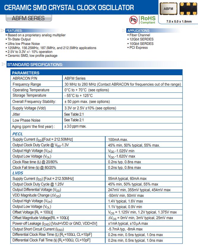 艾博康晶振,ABFM系列晶振,7050有源晶振,是只晶體本身起振需要外部電壓供應,起振后可直接驅動CMOS 集成電路,產品本身已實現與薄型IC(TSSOP封裝,TVSOP封裝)同樣的1mm厚度,斷開時的消費電流是15 µA以下,編帶包裝方式可對應自動搭載及IR回流焊接(無鉛對應)產品有幾種電壓供選1.8V,2.5V,3V3.3V,5V,以應對不同IC產品需要