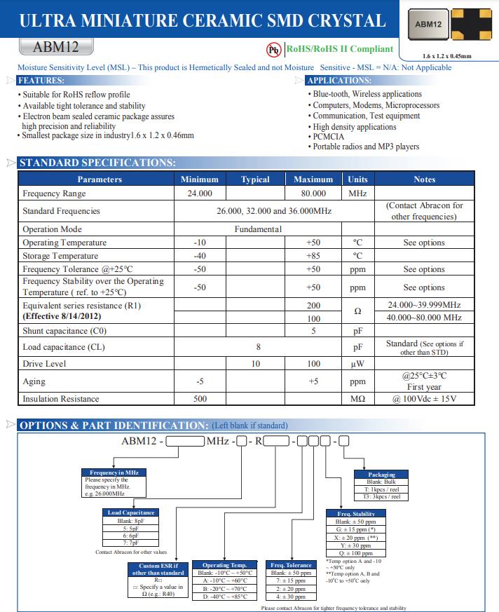 | ABM12-26.000MHZ-B2X-T3 | Abracon晶振 | ABM12 | 26 MHz | ±20ppm | 8pF |