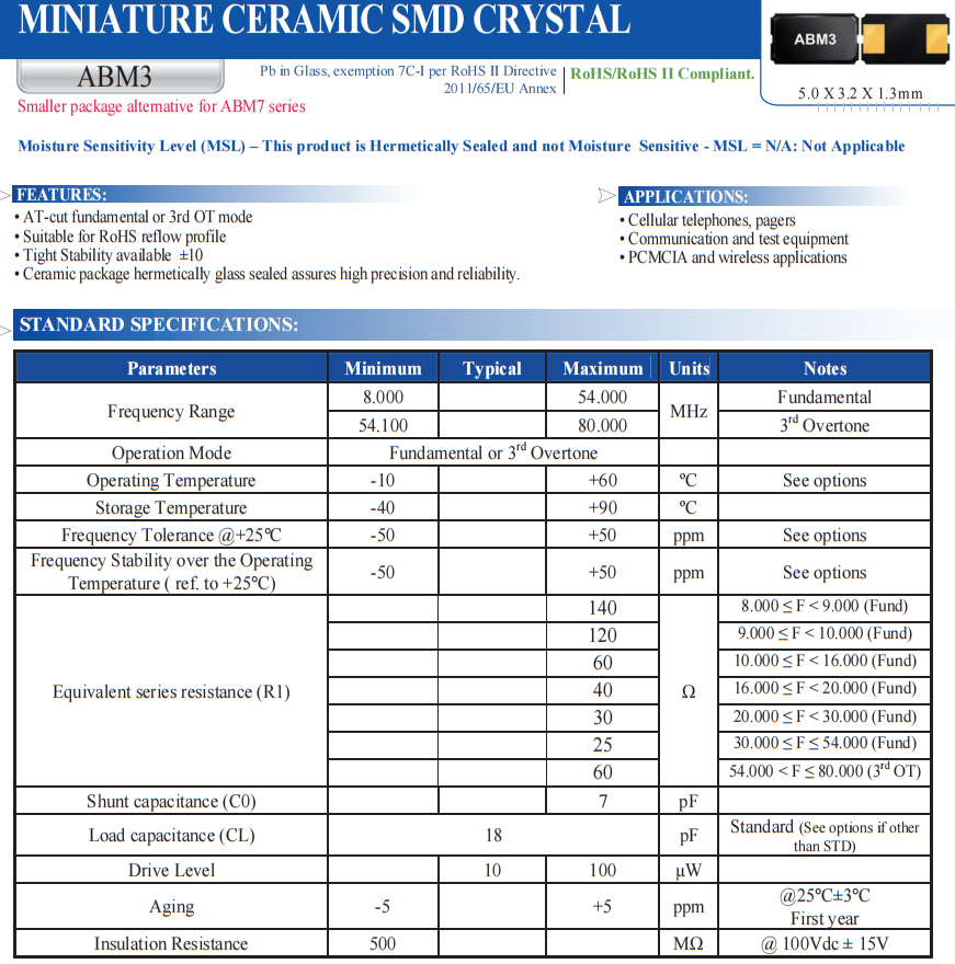 ABM3-24.576MHZ-B2-T,18PF,20PPM,24.576MHz,ABRACON,5032,歐美艾伯康晶振公司,水分敏感度水平(MSL)-本產(chǎn)品為密封密封且不對水分敏感- MSL = N/A:不適用,AT-cut基礎(chǔ)或第三OT模式適用于RoHS回流輪廓緊穩(wěn)定性可用±10陶瓷包裝密封玻璃密封,確保高精度和可靠性,蜂窩電話、尋呼機、通信和測試設(shè)備、PCMCIA和無線應(yīng)用