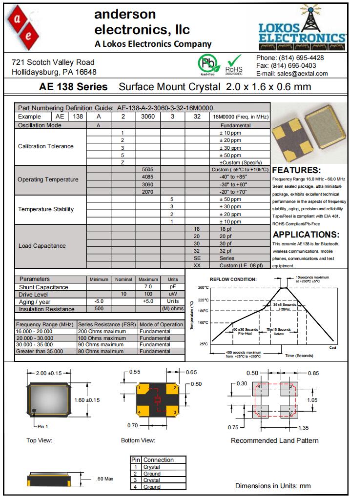 Anderson晶振|AE-138-A-2-5505-3-32-16M0000|2016超小型晶振,歐美進(jìn)口晶振,Anderson晶振,AE138貼片晶振,無源晶振,AE-138-A-2-5505-3-32-16M0000晶振,石英晶體諧振器,四腳貼片晶振,2016mm晶振,SMD晶體,頻率16MHz,負(fù)載32pF,工作溫度-55~105°C,頻率容差20pm,超小型晶振,耐高溫晶振,無鉛環(huán)保晶振,無線通信晶振,測(cè)試與測(cè)量設(shè)備晶振,移動(dòng)電話晶振,工業(yè)控制系統(tǒng)晶振.