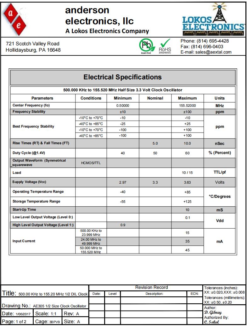 Anderson晶振|AE305正方形鐘振|125MHz規格表