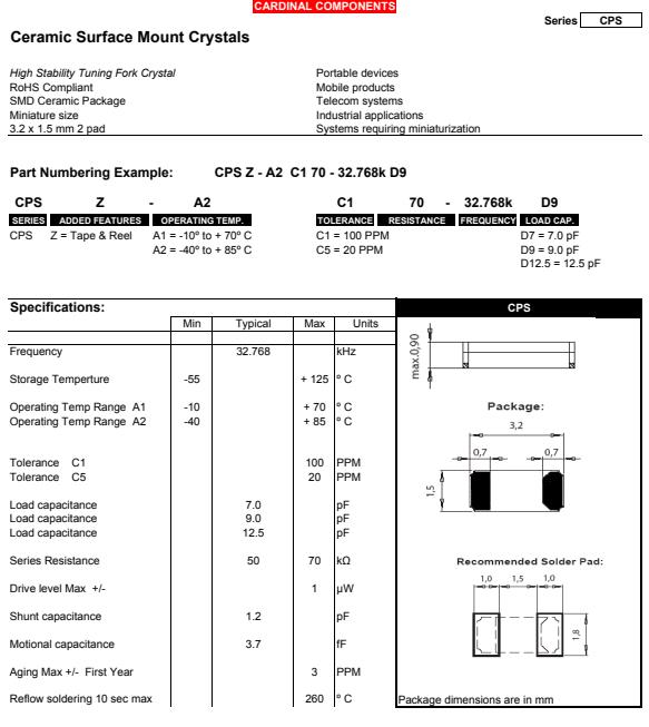 Cardinal晶振,CPS音叉晶體,GPSZ-A2C570-32.768K-D12.5晶振,貼片表晶32.768K系列具有超小型,薄型,質地輕的表面貼片音叉型石英晶體振蕩器,晶振產品本身具備優良的耐熱性,耐環境特性,在辦公自動化,家電領域,移動通信領域可發揮優良的電氣特性,符合無鉛標準,滿足無鉛焊接的回流溫度曲線要求,金屬外殼的石英晶振使得產品在封裝時能發揮比陶瓷晶振外殼更好的耐沖擊性能.