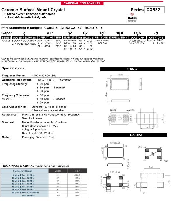 美國Cardinal晶振,CX532A無源晶體諧振器,CX532AZ-A2B4C4150-10.0D16-3晶振