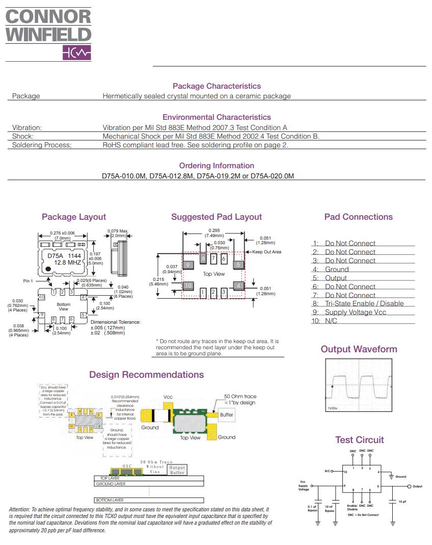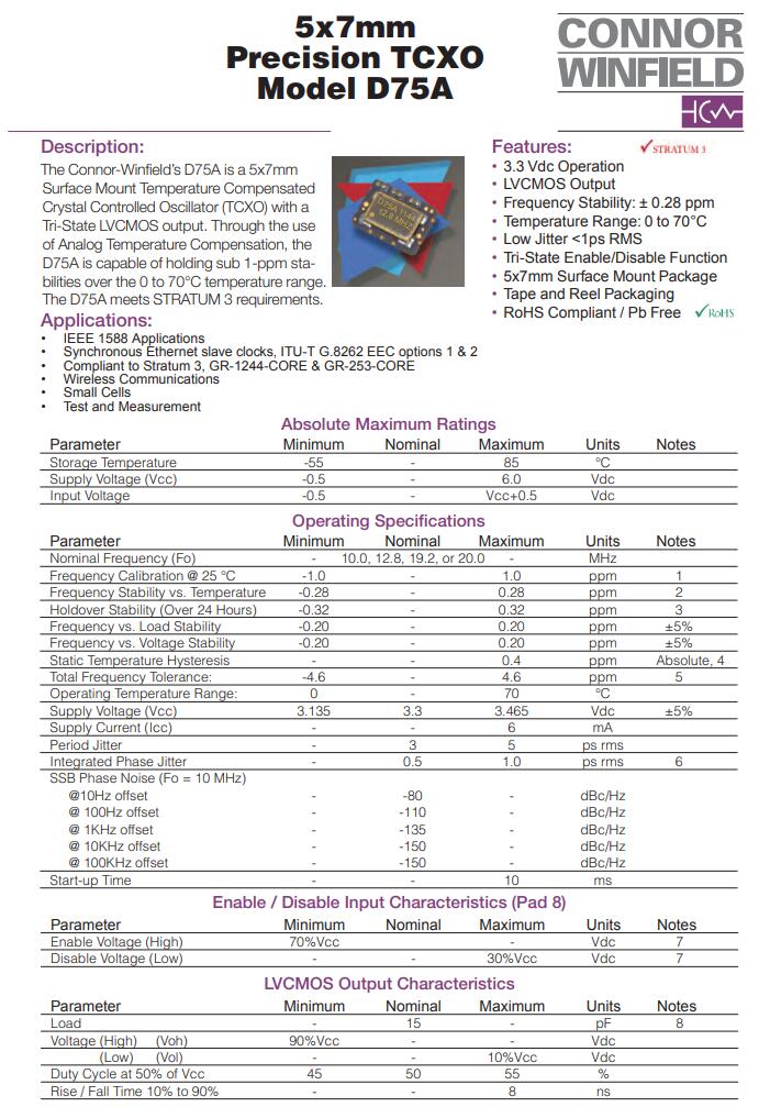 康納溫菲爾德晶振,D75A晶振,TCXO晶振