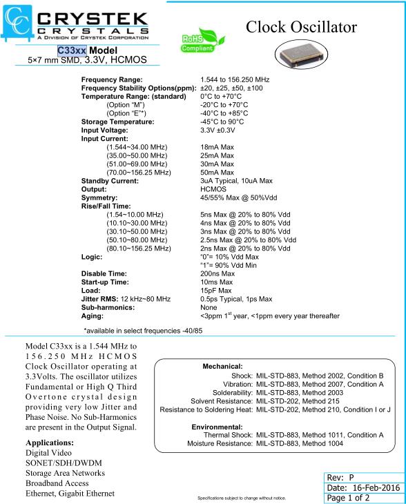 更多>>C33xx系列時鐘振蕩器,Crystek歐美晶體,C3392-20.000MHz晶振