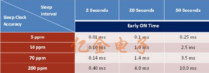 下表顯示,更嚴格,更高時鐘精度會縮短早期開啟時間,從而減少能量消耗.
