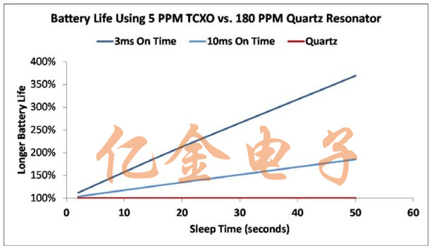 基于MEMS的SiT1552 TCXO晶振在溫度范圍內頻率變化小于5ppm,是一個很大的問題比石英晶體更準確的替代品.這種精確度減少了開啟時間并允許系統保持睡眠模式.使用SiT1552晶振,系統設計人員可以利用壓縮和傳輸數據僅在需要時短暫爆發,同時保持設備處于最低功耗睡眠狀態以進行延長周期并可能達到電池續航時間的兩倍.圖7顯示增加與180ppm 32.768kHz石英晶體相比,使用5ppm 32.768KHz TCXO可獲得電池壽命諧振器.