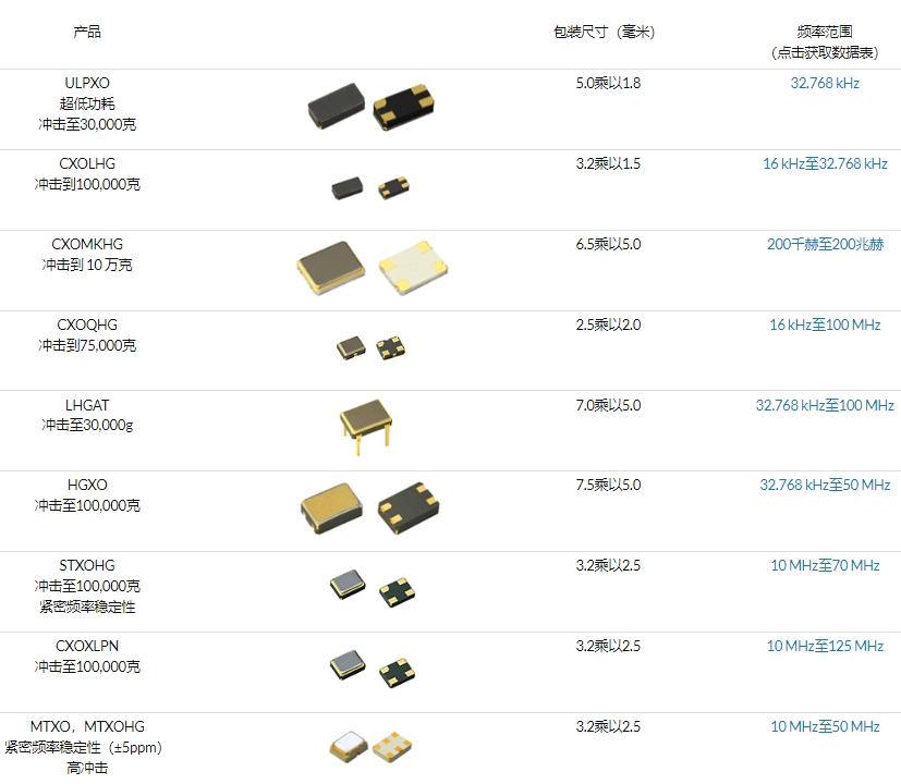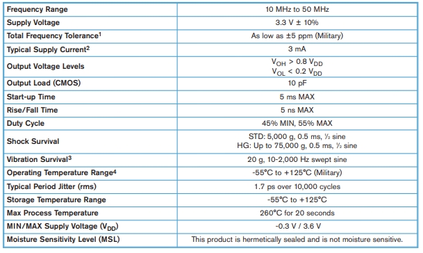 頻率穩定度:-40℃~85℃工況下±30ppm~±100ppm可選,-55℃~125℃工況下±50ppm~±100ppm可選,第一年老化±5ppm(根據頻率調整);