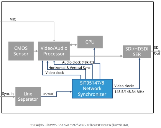 3、音視頻同步:麥克風音頻信號使用音頻處理器進行數字化處理。音頻采樣時鐘與視頻時鐘同步,以確保音頻和視頻流在嵌入到 SDI 流時完美對齊。