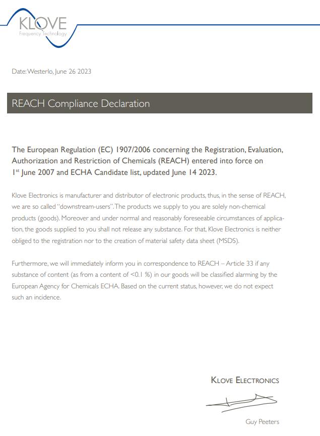 Klove Electronics是電子產品的制造商和經銷商,因此,在REACH的意義上,我們被稱為“下游用戶”。我們向您提供的產品僅為非化工產品(商品)。此外,在正常和可合理預見的應用環境下,提供給貴方的貨物不應釋放任何物質。為此,Klove Electronics既沒有義務進行注冊,也沒有義務創建材料安全數據表(MSDS)。