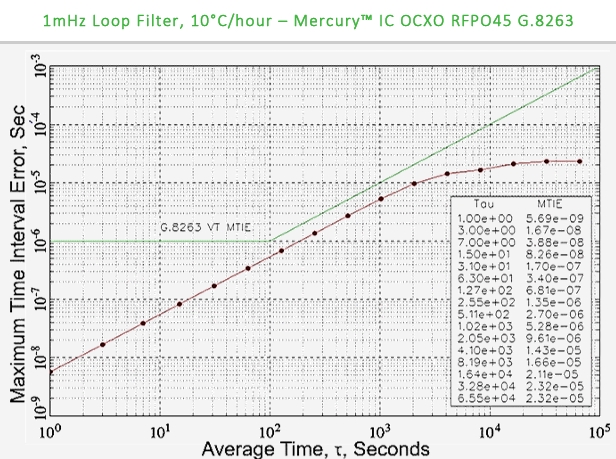 對于基于數(shù)據(jù)包的同步,振蕩器的中期穩(wěn)定性要求是關(guān)鍵。傳統(tǒng)上,傳輸設(shè)備過去需要 Stratum 3 級穩(wěn)定性,以支持系統(tǒng)中 0.1Hz 至 10Hz 的環(huán)路帶寬。基于 Packet 的 clocks 具有低得多的帶寬,為了滿足整個工作溫度范圍內(nèi)的 wander 生成指標(biāo),需要更穩(wěn)定的振蕩器。Rakon 與基于數(shù)據(jù)包的算法供應(yīng)商合作,測試振蕩器的各種環(huán)路帶寬,并對其進(jìn)行調(diào)整以滿足標(biāo)準(zhǔn)要求。下面顯示了使用 Rakon 振蕩器在 1mHz 下完成的 MTIE 測試,該振蕩器符合標(biāo)準(zhǔn)掩碼。
