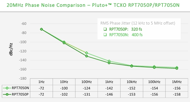 Rakon 與基帶 SoC 解決方案供應(yīng)商和無線電解決方案供應(yīng)商合作,以確保輕松滿足解決方案最佳性能的相位噪聲要求。以下是 Rakon 的 RPT 系列 TCXO 的典型相位噪聲圖,采用專利的 Pluto+ ™ 補(bǔ)償技術(shù)。