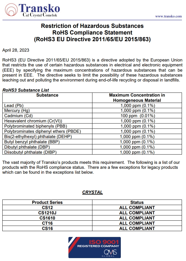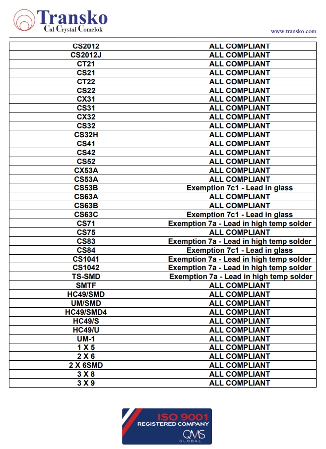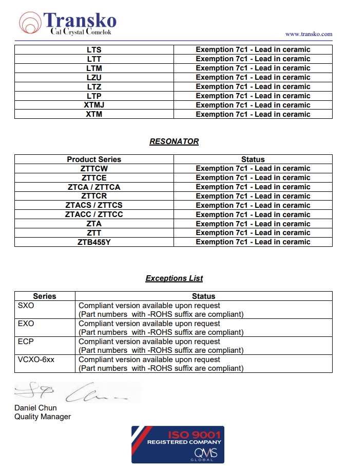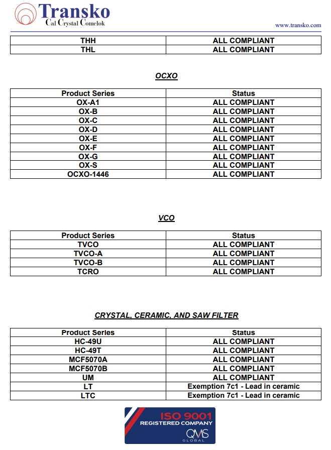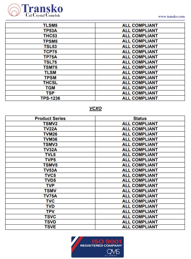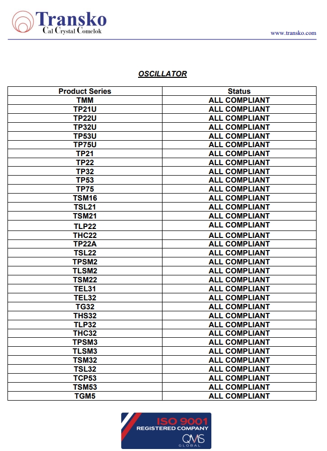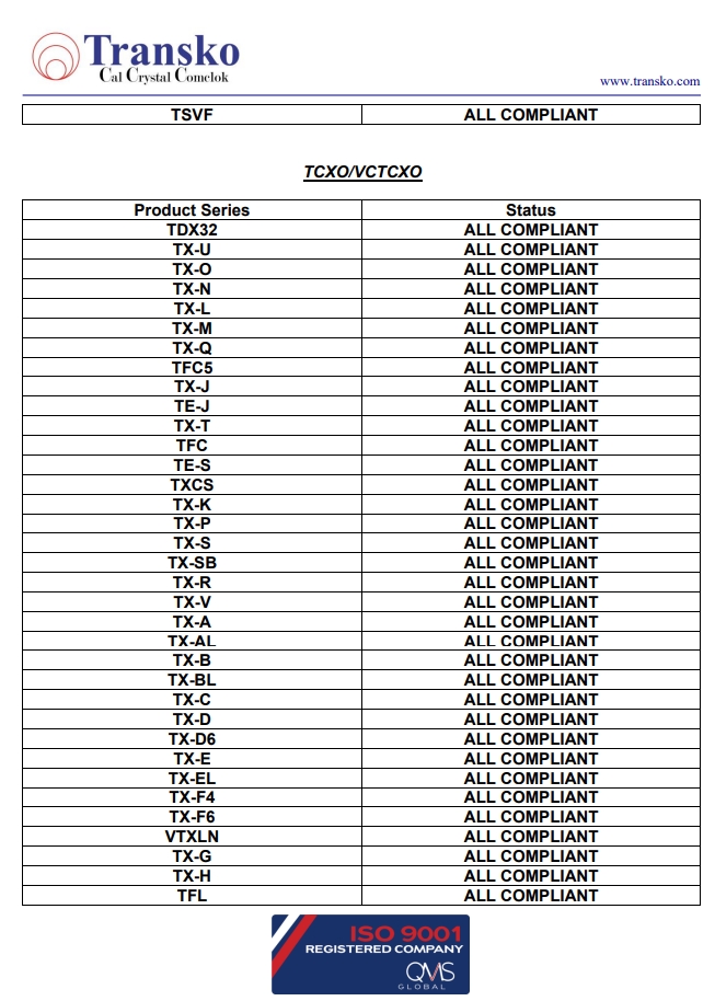 Transko Electronics, Inc.是一家領(lǐng)先的ISO 9001認(rèn)證的電子行業(yè)頻率控制產(chǎn)品制造商,實(shí)施質(zhì)量體系已滿足國(guó)家和國(guó)際質(zhì)量體系的要求的需要。一直以來,Transko晶振的質(zhì)量體系都持續(xù)符合ISO 9001的要求并不斷提高質(zhì)量管理體系的有效性。提供優(yōu)質(zhì)的產(chǎn)品和服務(wù)是Transko Electronics, Inc.的既定政策,始終如一地滿足客戶的需求,實(shí)現(xiàn)了領(lǐng)先同行的高質(zhì)量環(huán)保生產(chǎn)標(biāo)準(zhǔn)。
