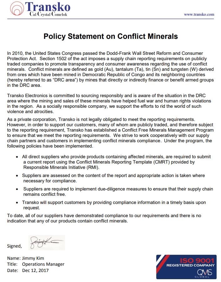 作為一家私營(yíng)公司,Transko在法律上沒有義務(wù)滿足報(bào)告要求。 然而,為了支持我們的客戶,他們中的許多人是公開交易的,因此受到根據(jù)報(bào)告要求,Transko制定了無沖突礦產(chǎn)管理計(jì)劃來確保我們符合報(bào)告要求。我們努力與供應(yīng)商合作實(shí)施沖突礦物法規(guī)的供應(yīng)鏈合作伙伴和客戶。根據(jù)該計(jì)劃已經(jīng)實(shí)施了以下政策:
