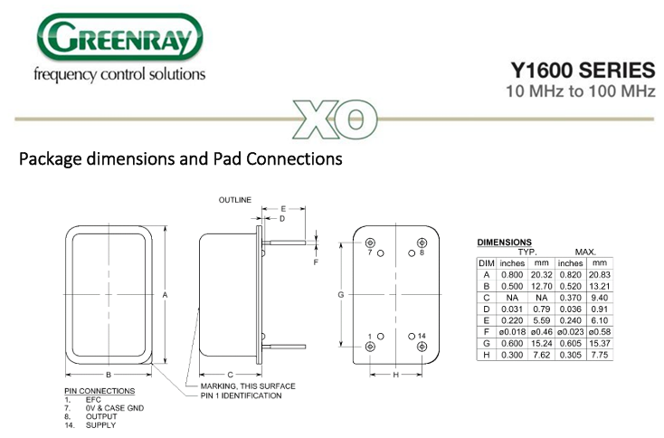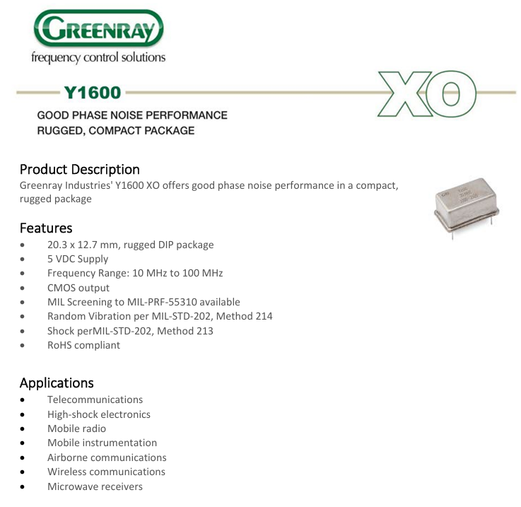 格林雷晶振Y1600 XO具有諸多令人矚目的特點.它采用20.3x12.7毫米堅固的DIP封裝,這種封裝不僅能有效保護內部精密元件,還能適應各種復雜的工作環境.5V直流電源的設計,既保證了穩定的供電,又符合大多數電子設備的電源標準.其頻率范圍覆蓋10MHz至100MHz,能滿足不同設備對頻率的多樣化需求.
