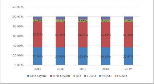 無源晶振產銷量在石英晶振市場中占較大份額.根據CS&A數據,2018年全球利用石英晶體制成的頻率元件產值為33億美元,其中無源產品產值為18億美元,占比為55.3%.石英晶體頻率元件年銷量180億顆,其中無源產品銷量為164.45億顆,占比為89.3%.