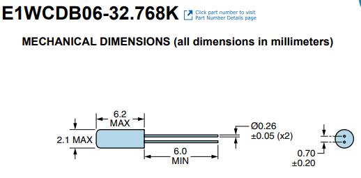 | E1WCDA12-32.768K | Fundamental | Watch Crystal 2.0mm x 6.0mm | ±20ppm | -10°C to +60°C | ±3ppm |