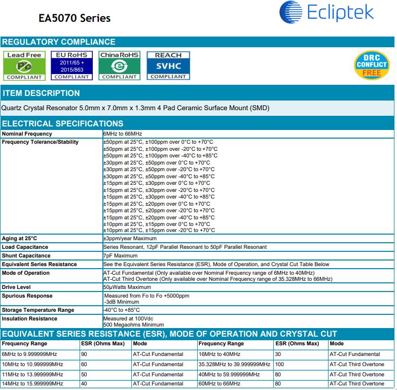 | EA5070MA16-6.000M | AT-Cut Fundamental | SMD Ceramic 5.0mm x 7.0mm | ±15ppm | -40°C to +85°C | ±3ppm | 7pF Maximum |