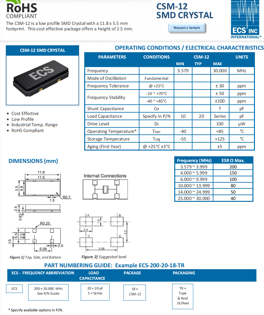 | ECS-120-18-18-TR | CSM-12 | MHz Crystal | 12MHz | ±100ppm | ±30ppm | 18pF |