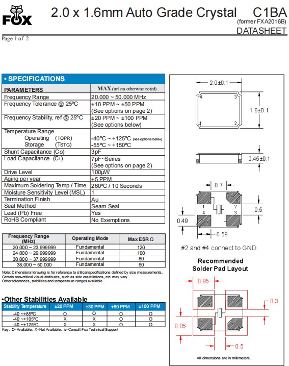 | FC1BACBEI50.0-T3 | Fox 晶振 | C1BA | 50 MHz | ±50ppm | ±30ppm | 10pF | -40°C ~ 125°C |