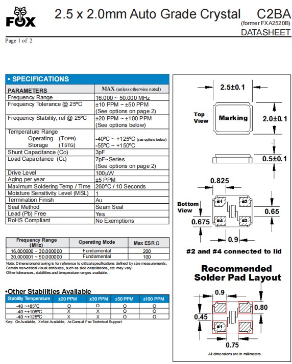 | FC2BACBEI25.0-T3 | Fox 晶振 | C2BA | 25 MHz | ±50ppm | ±30ppm | 10pF | -40°C ~ 125°C |