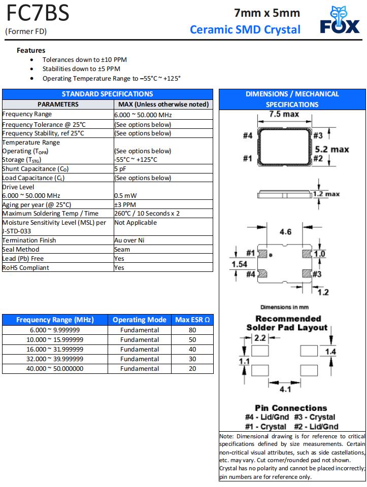 FC7BSCCMC10.0-T1,7050mm無源晶振,FOX晶體諧振器,智能家居晶振,規格表