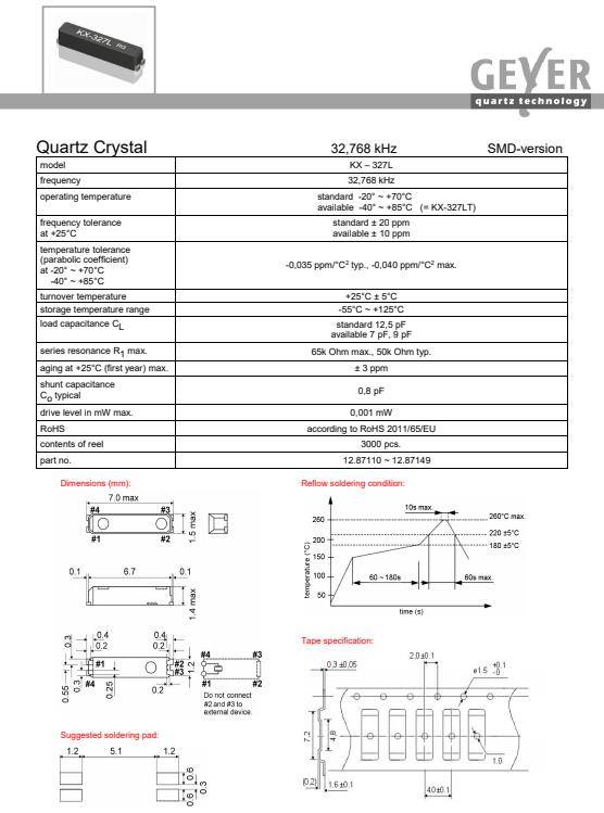 格耶晶振,KX-327L貼片晶振,12.87110~12.87149無源晶振,32.768KHZ晶振具有小型,薄型,輕型的貼片型表面音叉型晶體振蕩器,產品具有優良的耐熱性,耐環境特性,可發揮晶振優良的電氣特性,符合RoHS規定,滿足無鉛焊接的高溫回流溫度曲線要求,金屬外殼的封裝使得產品在封裝時能發揮比陶瓷振蕩器外殼更好的耐沖擊性.