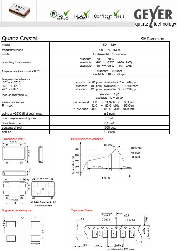 GEYER晶振,KX-12A高品質(zhì)晶振,SMD無源晶振,貼片晶振本身體積小,超薄型石英晶體振蕩器,特別適用于有目前高速發(fā)展的高端電子數(shù)碼產(chǎn)品,因為晶振本身小型化需求的市場領(lǐng)域,小型,薄型是對應(yīng)陶瓷振蕩器(偏差大)和普通的石英晶體振蕩器(偏差小)的中間領(lǐng)域的一種性價比較出色的產(chǎn)品.產(chǎn)品廣泛用于筆記本電腦,無線電話,衛(wèi)星導航SSD,USB,Blu-ray等用途,符合無鉛焊接的高溫回流焊曲線特性.