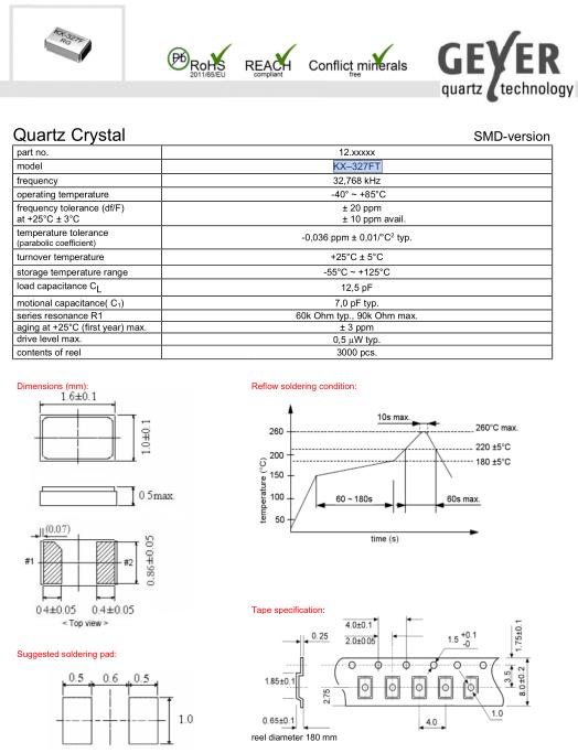 GEYER晶振,KX–327FT無源晶體,32.768K晶振,貼片表晶32.768K系列千赫晶體KHZ具有超小型,薄型,質地輕的表面貼片音叉型石英晶體振蕩器,晶振產品本身具備優良的耐熱性,耐環境特性,在辦公自動化,家電領域,移動通信領域可發揮優良的電氣特性,符合無鉛標準,滿足無鉛焊接的回流溫度曲線要求,金屬外殼的石英晶振使得產品在封裝時能發揮比陶瓷晶振外殼更好的耐沖擊性能.