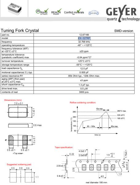 德國格耶晶振,KX-327RF貼片晶振,12.87166晶振,貼片表晶32.768KHZ晶振系列具有超小型,薄型,質(zhì)地輕的表面貼片音叉型石英晶體振蕩器,晶振產(chǎn)品本身具備優(yōu)良的耐熱性,耐環(huán)境特性,在辦公自動化,家電領(lǐng)域,移動通信領(lǐng)域可發(fā)揮優(yōu)良的電氣特性,符合無鉛標(biāo)準(zhǔn),滿足無鉛焊接的回流溫度曲線要求,金屬外殼的石英晶振使得產(chǎn)品在封裝時能發(fā)揮比陶瓷晶振外殼更好的耐沖擊性能.