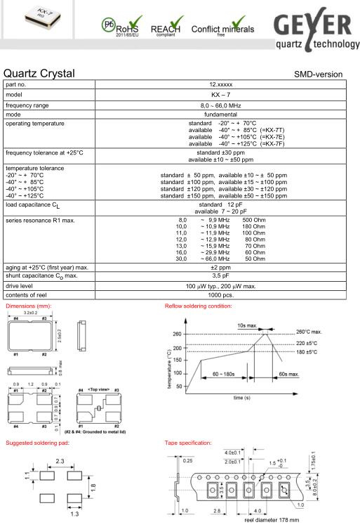 GEYER格耶晶振,KX-7高精度晶振,3225無源晶體,3225mm體積貼片晶振適用于汽車電子領域的表面貼片型石英晶振,本產品已被確定的高信賴性最適合用于汽車電子部件,晶體在極端嚴酷的環境條件下也能發揮穩定的起振特性,晶振本身具有耐熱,耐振,耐沖擊等優良的耐環境特性,滿足無鉛焊接的高溫回流溫度曲線要求,符合AEC-Q200標準.
