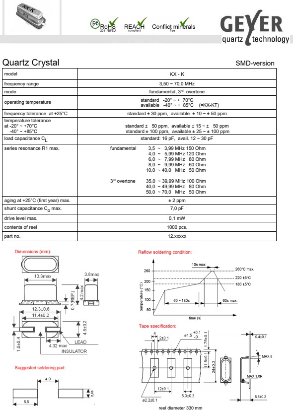 fundamental 3,5 ~ 3,99 MHz 150 Ohm 4,0 ~ 5,99 MHz 120 Ohm 6,0 ~ 7,99 MHz 80 Ohm 8,0 ~ 9,99 MHz 60 Ohm 10,0 ~ 40,0 MHz 50 Ohm 3rd overtone 35,0 ~ 39,99 MHz 100 Ohm 40,0 ~ 49,99 MHz 80 Ohm 50,0 ~ 70,0 MHz 50 Ohm |