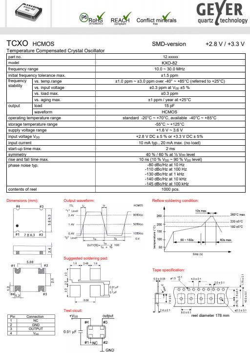 GEYERCrystal,KXO-82有源振蕩器,7050mm貼片晶振,溫補晶振(TCXO)產品本身具有溫度補償作用,高低溫度穩定性:頻率精度高0.5PPM-2.0PPM,工作溫度范圍:-30度至85度,電源電壓:1.8V-3.3V之間可供選擇,產品本身具有溫度電壓控制功能,世界上最薄的晶振封裝,頻率:26兆赫,33.6兆赫,38.4兆赫,40兆赫,因產品性能穩定,精度高等優勢,被廣泛應用到一些比較高端的數碼通訊產品領域,GPS全球定位系統,智能手機,WiMAX和蜂窩和無線通信等產品,符合RoHS/無鉛.