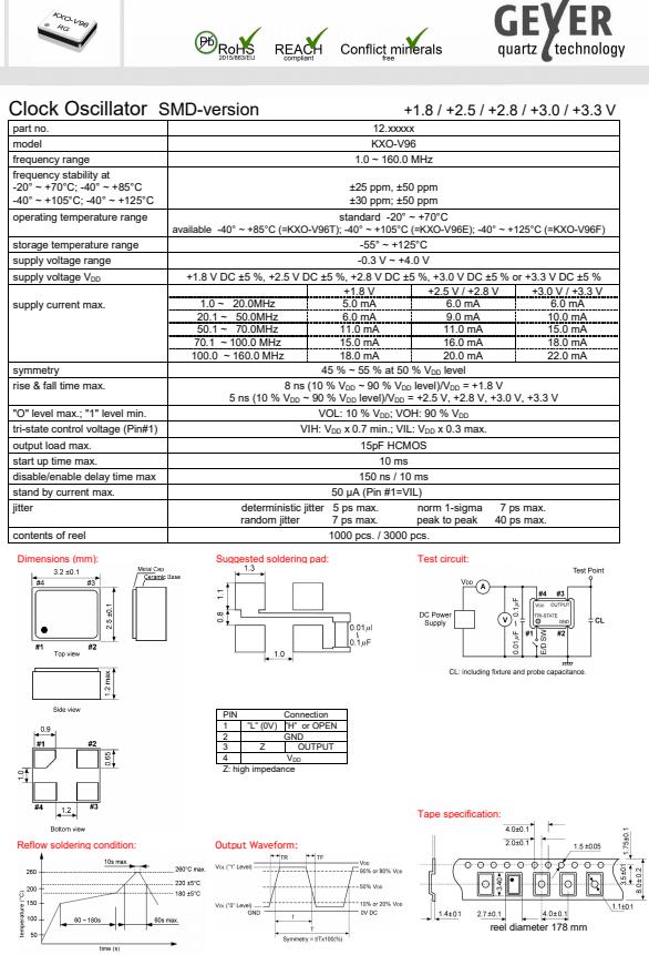 格耶德國晶振,KXO-V96貼片有源晶振,3225mm振蕩器,小型SMD有源晶振,從最初超大體積到現在的7050mm,6035mm,5032mm,3225mm,2520mm體積,有著翻天覆地的改變,體積的變小也使產品帶來了更高的穩定性能,接縫密封石英晶體振蕩器,精度高,覆蓋頻率范圍寬的特點,SMD高速自動安裝和高溫回流焊設計,Optionable待機輸出三態輸出功能,電源電壓范圍:1.8V~5V,高穩定性,低抖動,低功耗,主要應用領域:無線通訊,高端智能手機,平板筆記本WLAN,藍牙,數碼相機,DSL和其他IT產品的晶振應用,三態功能,PC和LCDM等高端數碼領域,符合RoHS/無鉛.
