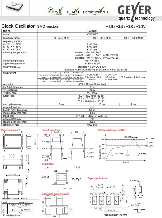 GEYER格耶晶振,KXO-V97帶電壓晶振,石英晶體振蕩器,小型SMD有源晶振,從最初超大體積到現在的7050mm,6035mm,5032mm,3225mm,2520mm體積,有著翻天覆地的改變,體積的變小也使產品帶來了更高的穩定性能,接縫密封石英晶體振蕩器,精度高,覆蓋頻率范圍寬的特點,SMD高速自動安裝和高溫回流焊設計,Optionable待機輸出三態輸出功能,電源電壓范圍:1.8V~5V,高穩定性,低抖動,低功耗,主要應用領域:無線通訊,高端智能手機,平板筆記本WLAN,藍牙,數碼相機,DSL和其他IT產品的晶振應用,三態功能,PC和LCDM等高端數碼領域,符合RoHS/無鉛.