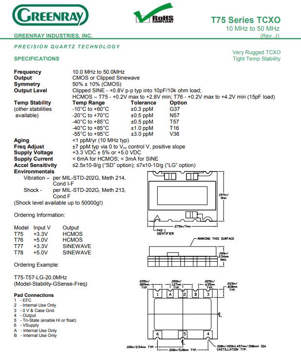 Greenray格林雷晶振實業公司從研發生產到銷售所使用的材料均符合ROHS環保要求,所生產的石英晶振晶體達到了歐盟環保要求.Greenray購買的所有部件和材料都是經過檢查嚴格按照標準并且符合RoHS標準的制造商所提供.進口GREENRAY晶振,T75型號晶振,7050溫補晶振