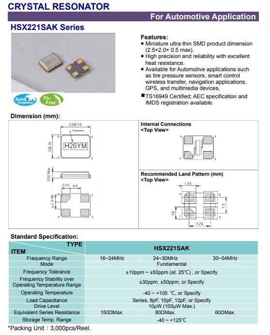加高晶振,HSX221SAK晶振,2520小體積晶振