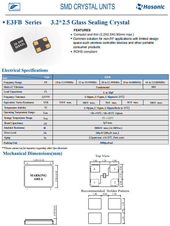 | E3FB20.0000F18E33 | Hosonic晶振 | E3FB | 20MHz | 18pF | ±30ppm | ±30ppm | 3.2 x 2.5 x 0.8 mm |