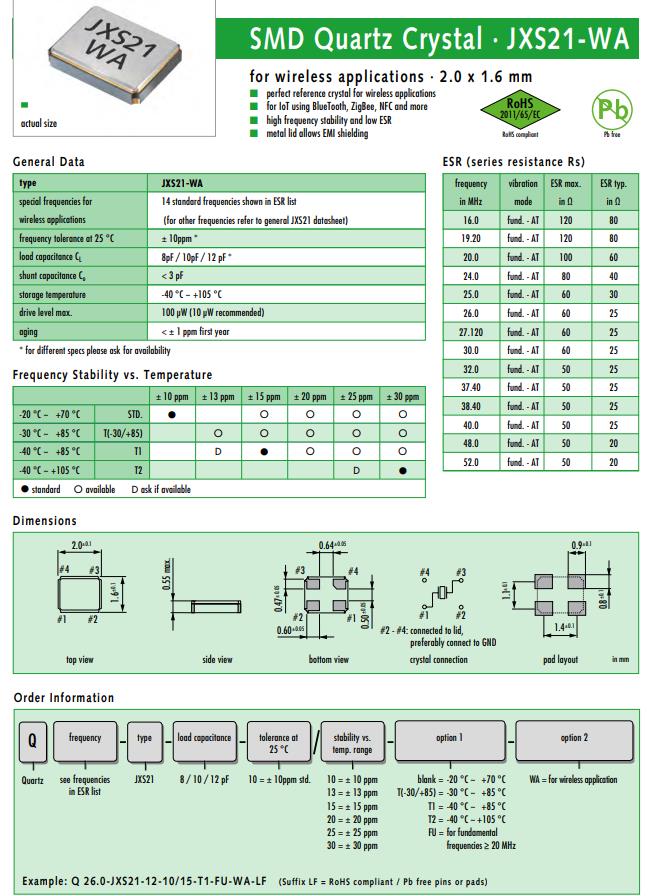 | Q 20.0-JXS21-12-10/10-FU-WA-LF | Jauch晶振 | JXS21-WA | 20MHz | ±10ppm | 12pF |