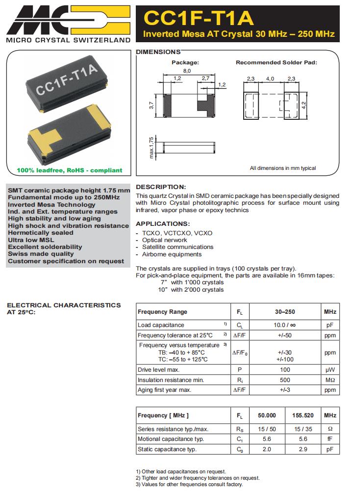 CC1F-T1A-106.250MHz-10.0pF-50ppm-TB-QI|耐高溫晶振|6G通信晶振,Micro石英晶振,CC1F-T1A無源晶振,CC1F-T1A-106.250MHz-10.0pF-50ppm-TB-QI晶振,8037mm貼片晶振,頻率106.25MHz,負載10pf,頻率穩定性50ppm,工作溫度-40~125°C,耐高溫晶振,抗沖擊晶振,6G通信晶振,遙感勘測晶振,光學網絡晶振,機載設備晶振,保健和醫療設備晶振.