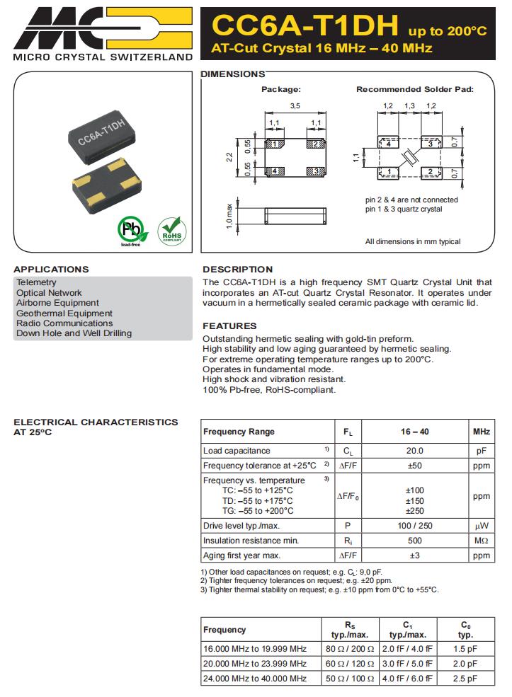 CC6A-T1DH-24.000MHz-20.0pF-50ppm-TC-QI|6G無線電通信晶振|耐高溫晶振,Micro晶振,CC6A-T1DH是一種高頻SMT石英晶體單元,CC6A-T1DH-24.000MHz-20.0pF-50ppm-TC-QI晶振,適用于高達200°C的極端工作溫度范圍,頻率24MHz,負載20pf,頻率穩定性100ppm,工作溫度-55~125°C,耐高溫晶振,高穩定性晶振,6G無線電通信晶振,遙感勘測晶振,地熱設備應用晶振,井下和鉆井設備應用晶振.