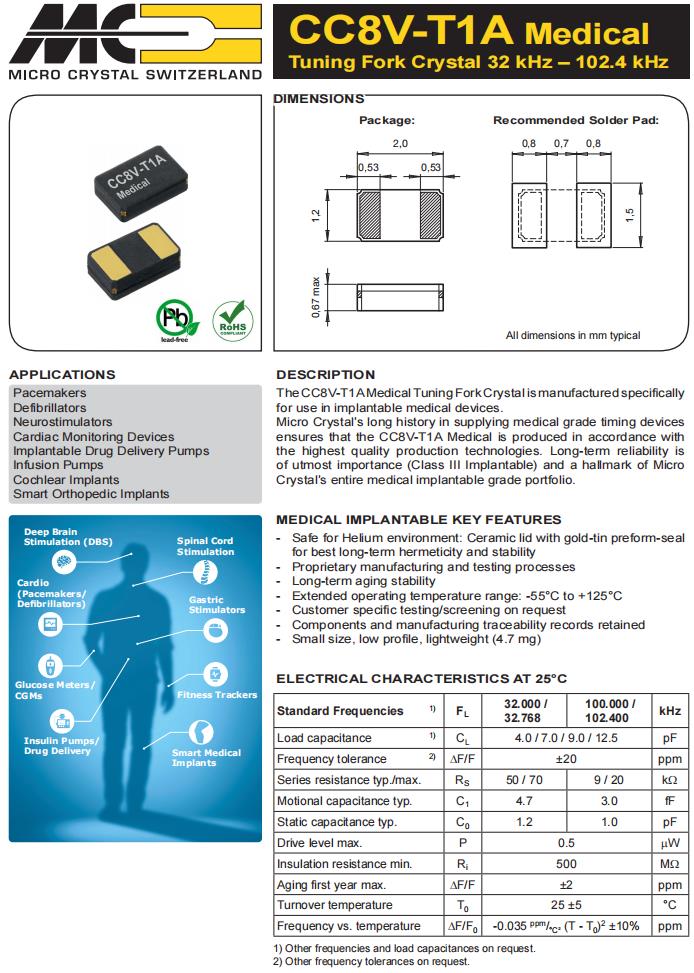 CC8V-T1A-32.768kHz-12.5pF-20ppm-TB-QM,2012mm音叉晶體,醫療設備專用晶振,CC8V-T1A醫用音叉晶體,無源晶振,編碼CC8V-T1A-32.768kHz-12.5pF-20ppm-TB-QM,是專門為植入式醫療設備制造的,Micro Crystal在提供醫療級計時設備方面的悠久歷史確保了CC8V-T1A醫療按照最高質量的生產技術生產,頻率32.768KHz,尺寸2012mm音叉,負載12.5pF,是醫療設備專用晶振,可用于心臟起搏器,去纖顫器,耳蝸植入設備等產品.