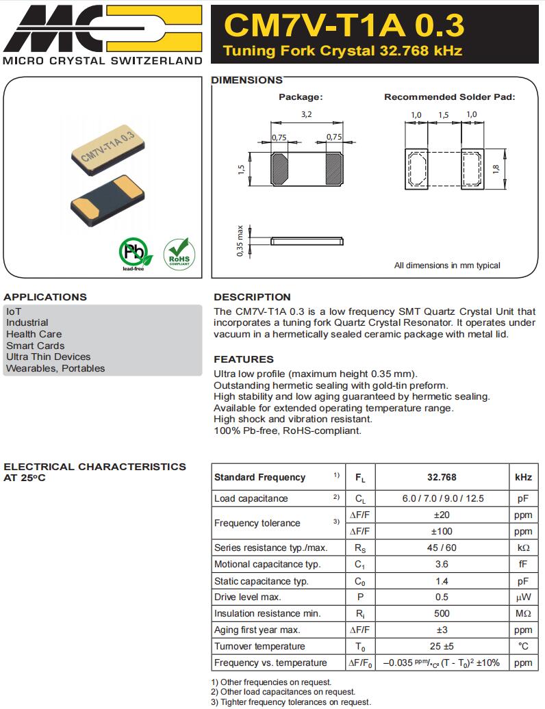 | CM7V-T1A-0.3-32.768kHz-7pF-20PPM-TA-QC | Micro Crystal | 晶體 32.768 kHz 7.0 pF +/-20 PPM 0.3mm |