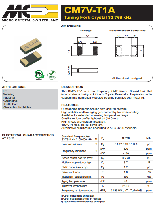 CM7V-T1A32.768kHz12.5pF±20ppmTBQA|6G路由器晶振|瑞士微晶晶振規格表