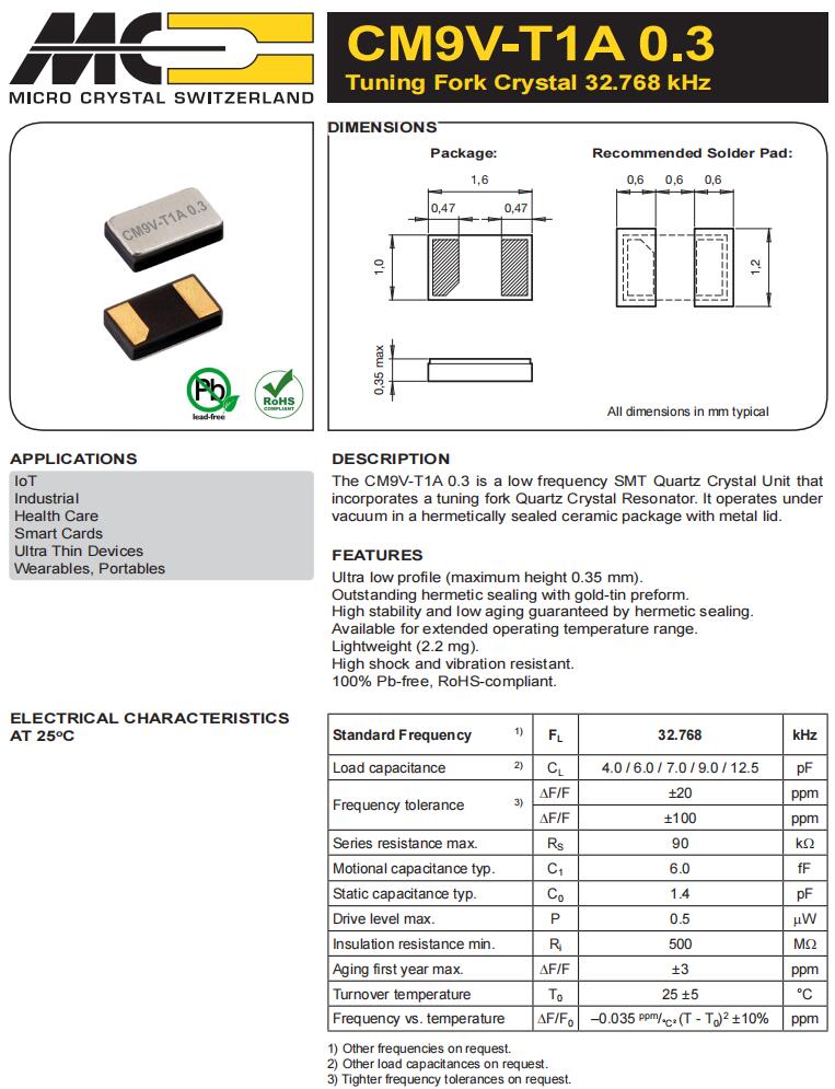 | CC1V-T1A-32.768kHz-9pF-30PPM-TA-QC | Micro Crystal | 晶體 32.768 kHz 9.0 pF +/-30 PPM -40/+85C |