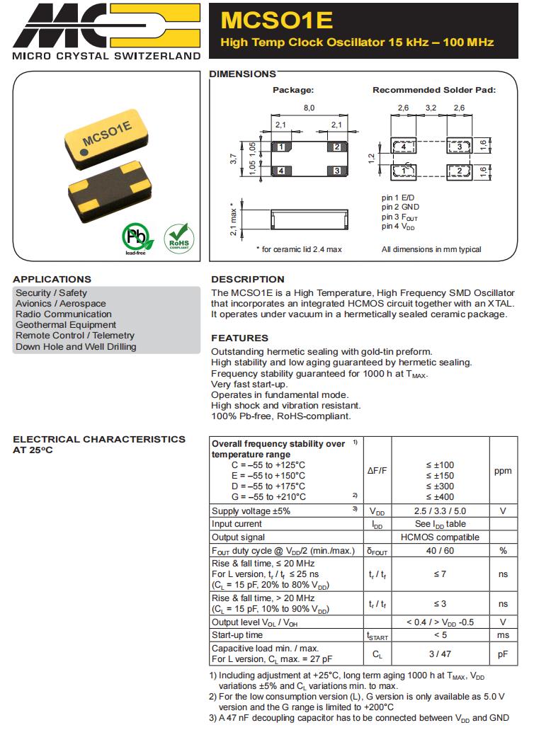MCSO1ECHV-C-40.000MHz-E/D-T3|耐高溫晶振|6G基站晶振規格表
