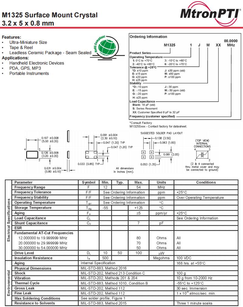 M1325S143 12.000000,MtronPTI品牌晶振,5032mm石英晶體,便攜式儀器晶振,規格表
