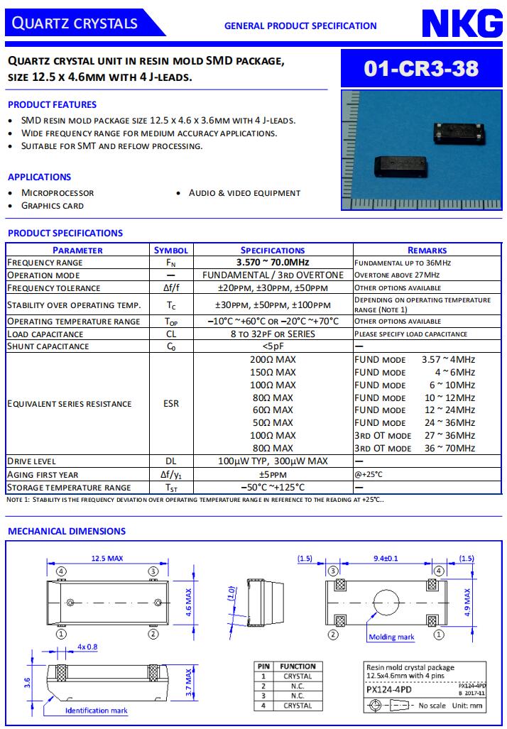 NKG晶振|01-CR3-38-24M576-T30-3050E-EXT|進口陶瓷晶振,NKG晶振,香港進口晶振,01-CR3-38無源晶振,陶瓷晶振,01-CR3-38-24M576-T30-3050E-EXT晶振,石英晶體諧振器,12.5 x 4.6 mm晶振,四腳貼片晶振,SMD晶振,頻率24.576MHz,負載30pF,工作溫度-20~70°C,頻率容差30pm,無鉛環保晶振,高穩定性晶振,低老化晶振,微處理器晶振,顯卡晶振,影音設備晶振,專業視頻設備晶振.