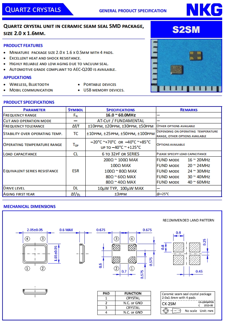 NKG Crystal|S2SM20.000F20M23-EXT|2016mm石英晶振特點(diǎn)