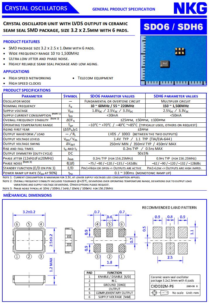 NKG Crystal|SDO6-8-B-125.00-WNS-EXT|LVDS晶振規格表